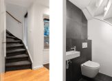 Separaat is op zowel de begane grond als de eerste verdieping een toiletruimte in dezelfde kleurstijl afgewerkt.