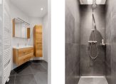 De moderne badkamer is geheel betegeld in hedendaagse grijs-wittinten en voorzien van een riante inloopdouche, wastafelmeubel met 2 kranen, spiegelkast, designradiator en inbouwspots.