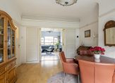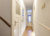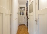 De riante woonkamer is middels de authentieke kamer en suite deuren met vaste kasten verdeeld in de zithoek en de eethoek en heeft een diepte van maar liefst 10 meter. De zit hoek is voorzien van een sfeervolle schouw met sier gashaard en glas-in-loodramen aan de voorzijde. De eetkamer aan de achterzijde is voorzien van een toegang tot de keuken en dubbele openslaande deuren naar het balkon. Verder keurig afgewerkt met een eiken parketvloer en origineel stucwerk plafonds.