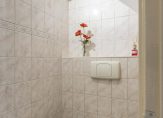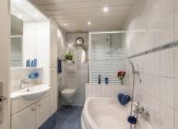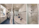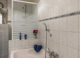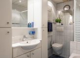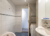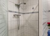 De ruime badkamer van circa 6 m² is betegeld tot het plafond en voorzien van een douchecabine, een ligbad, wastafelmeubel met spiegel, 2e hangend closet en de wasmachine- en wasdroger opstelling.