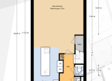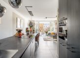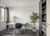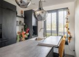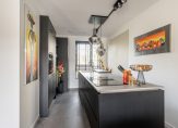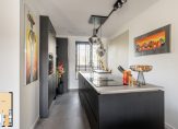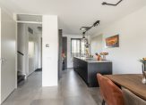 Aan de voorzijde bevindt zich de moderne open keuken van circa 9 m², uitgevoerd met houtlook matzwarte fronten en een betonlook werkblad. De keuken is voorzien van alle hedendaagse luxe inbouwapparatuur, waaronder een inductie-combikookplaat met downdraft-afzuiging, combi-stoomoven, koel-vriescombinatie, vaatwasser en een spoelbak met kokendwaterkraan. De keuken beschikt bovendien over een praktische zitbar met stopcontact en een sfeervolle koffiecorner.