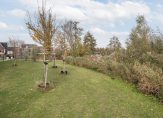 Aan een autovrij pad, met uitzicht op groen en een vijver aan de voorzijde, ligt de verzorgde voortuin. Deze is fraai aangelegd met antracietkleurige bestrating, een grindbed, een beukenhaag en ruimte voor een gezellig zitje.