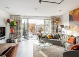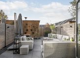 De ruime uitgebouwde woonkamer van maar liefst 37 m² is licht en sfeervol, met dubbele openslaande deuren naar de zonnige achtertuin op het westen. Hier geniet je in alle privacy van lange zomeravonden op het terras, compleet met berging en achterom.
