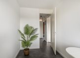 De moderne badkamer van circa 5 m² is compleet uitgerust met een inloopdouche voorzien van stortdouche en easydrain-regengoot, een half vrijstaand ligbad (LUCA ‘semi back to wall bad’), tweede hangend toilet, wastafelmeubel met waskom en spiegel, designradiator en mechanische ventilatie. De badkamer is tot aan het plafond fraai betegeld.