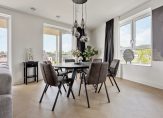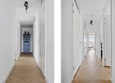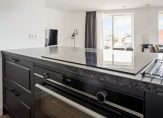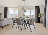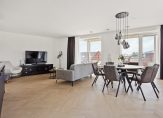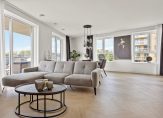 Zonnige woonkamer van circa 38 m² op een hoek met meerdere raampartijen, pvc houtlook vloerafwerking in Hongaarse punt gelegd met hoge plinten, vloerverwarming/vloerkoeling (zoals in nagenoeg de gehele woning) , strakke afwerking en deur naar het balkon. In de woonkamer is ook een videophone om de deur te openen voor bezoekers.