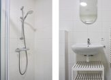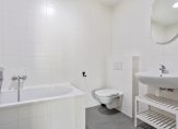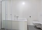 Moderne badkamer met inloop douchecabine, ligbad, 2e hangend toilet, wastafel met spiegel en een elektrische design radiator. Verder keurig betegeld in grijs/witte kleurstelling tot het plafond en voorzien van mechanische luchtafzuiging,