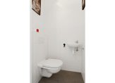 Modern toilet met hangend closet, hand wasbakje, gedeeltelijk betegeld in grijs/witte kleurstelling en mechanische luchtafzuiging.