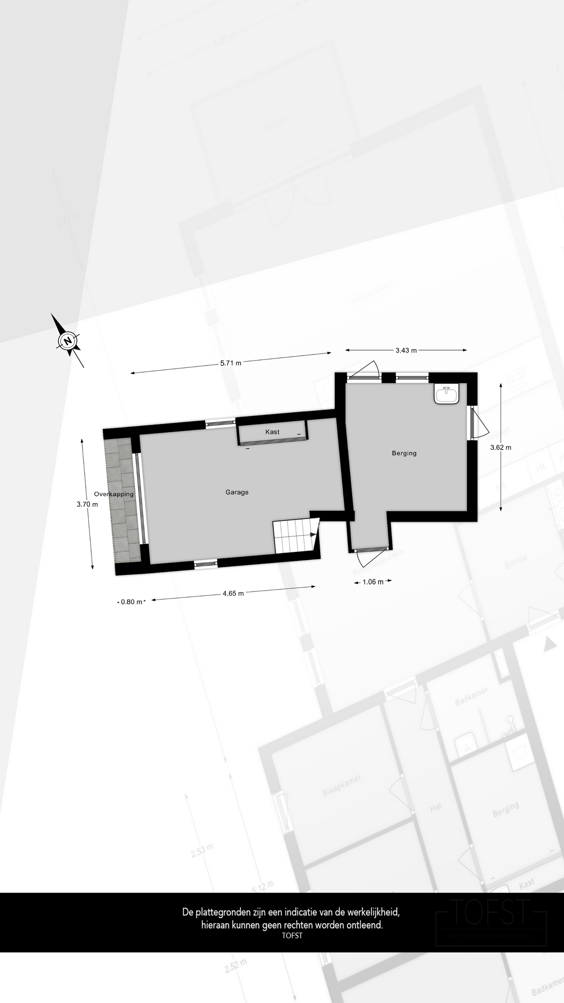 Het zeer ruime bijgebouw, te gebruiken als garage of werkruimte, heeft een oppervlakte van maar liefst 47 m². Het linkerdeel betreft de garage met zolder, ook te gebruiken als ideale schilder of werkplek. Het rechtergedeelte betreft de berging welke een eigen ingang heeft, maar ook bereikbaar is via de garage.