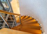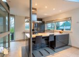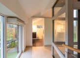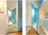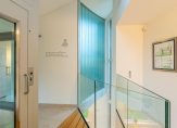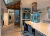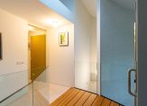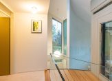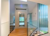 Volg de verlichting op de geweldige zwevende houten trap met aluminium elementen of neem de glazen lift naar de eerste verdieping. Vanaf de ruime overloop zijn de badkamer en de inpandige was- en stookruimte bereikbaar. Middels de loopbrug met houten vloerdelen en de glazen balustrade heeft u zicht op de open keuken en zijn drie slaapkamers, de badkamer, het 2e toilet en ook de inloopkast te bereiken.