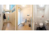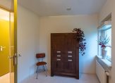 De hal is een ruime ontvangsthal met de ruime toiletruimte voorzien van een hangend closet, hand wasbakje en goede lichtinval door de met mat glas gevulde pui.