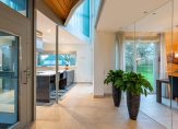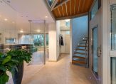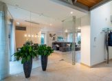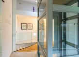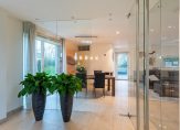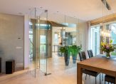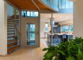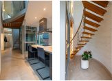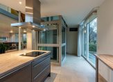 Loopt u verder dan komt u uit in het hart van het huis met zwevende trap en glazen lift naar de eerste verdieping. Tevens vindt u hier de toegang tot de open keuken en woonkamer, ook is er contact met de verdieping door de fraaie vides. In de hal, woonkamer en keuken ligt een plavuizen vloer met vloerverwarming, hoge plinten. En de wanden zijn, net als de plafonds, gestuct, voorzien van verlichting inbouwarmaturen.