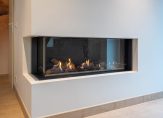 – Heerlijke woonkamer met sier gashaard en glazen pui met taats deur naar de open keuken;