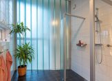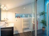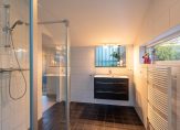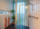 De moderne badkamer van circa 8,5 m² is stijlvol ingedeeld met een inloopdouche voorzien van een veiligheidsglazen scherm, wastafelmeubel met spiegel voorzien van verlichting, design radiator en te openen raam. Het oplopend plafond versterkt het ruimtelijke gevoel. De hoge glazen bouwstenen wand maakt de goede sfeer in de badkamer helemaal af.