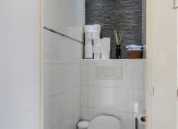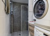 De moderne badkamer is geheel betegeld in moderne tinten en is voorzien van zowel een inloopdouche, wastafelmeubel, bergkast en de opstelling voor de wasmachine en droger.