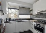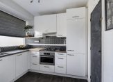 De moderne L-vormige keukenopstelling is aan de voorzijde van de woning opgesteld in hoogglans wit. De keuken is voorzien van een gaskookplaat met recirculatiekap, koel-/vriescombinatie, vaatwasser en combi-magnetron.