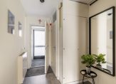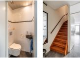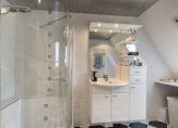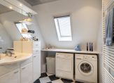 Moderne badkamer, circa 6 m², voorzien van douchecabine, wastafelmeubel met spiegel voorzien van verlichting, 2e hangend toilet, design radiator, opstelling wasmachine/ wasdroger, dakraam en betegeld tot het plafond voorzien van inbouwspots en mechanische afzuiging.