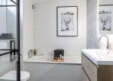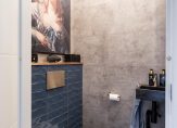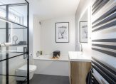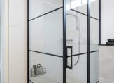De luxe badkamer is in 2021 volledig vernieuwd, geheel betegeld in hedendaagse kleurtinten en voorzien van zowel een ligbad, als inloopdouche met zwart glazen wanden, houten wastafelmeubel, spiegel met verlichting en verwarming, tweede hangend toilet, designradiator en ventilator. Het bovenlicht biedt natuurlijke ventilatie en lichtinval.