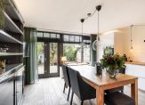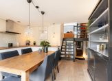 Via een trapje komt u uit in de riante woonkeuken met massief eiken vloer, die ideaal is voor een grote tafel om lekker lang te tafelen!