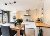 De L-vormige keukenopstelling is in 2018 compleet vernieuwd en van alle gemakken voorzien. De keuken beschikt namelijk over een inductiekookplaat met recirculatiekap, vaatwasser, combi-magnetron, oven met stoomfunctie, koelkast en veel kastruimte.