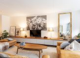 Vanuit de woonkeuken komt u met een trapje in de ruime woonkamer, die aan de voorzijde van de woning is gelegen. Door de grote raampartijen komt er veel natuurlijk licht de woning binnen. Deze heerlijke ruimte is voorzien van een strakke wand- en vloerafwerking, houten kozijnen met dubbel glas en een elektrische sfeerhaard.