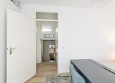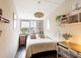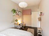 Vanuit de hal, met veel lichtinval door glazen wandafscheiding, wordt de toegang verstrekt tot de eerste twee slaapkamers, die gelegen zijn aan de achterzijde van de woning. De slaapkamers hebben een oppervlakte van ruim 10 en bijna 9 m² en zijn voorzien van strakke wand- en vloerafwerking en houten kozijnen met dubbel glas.