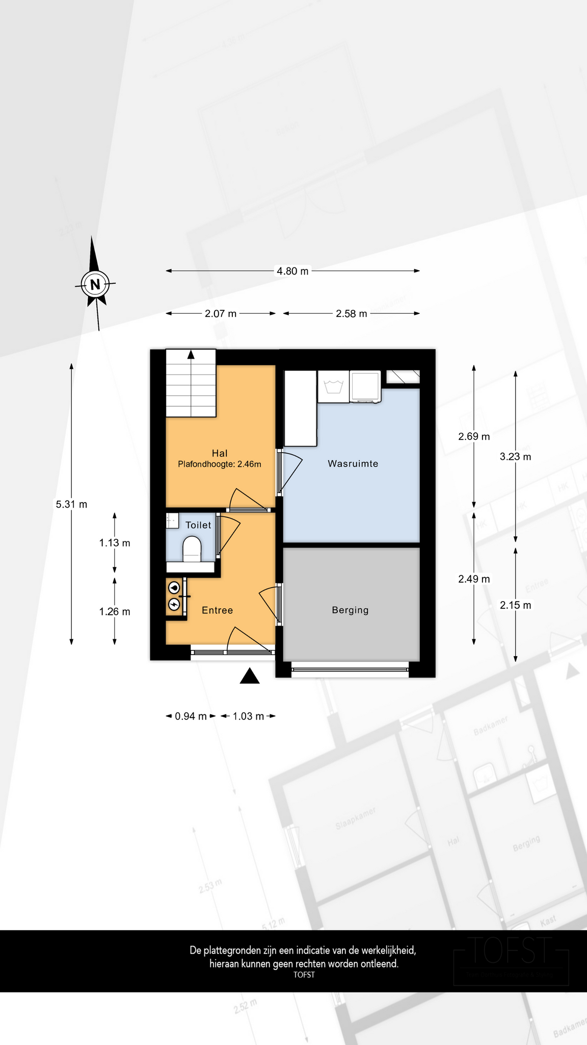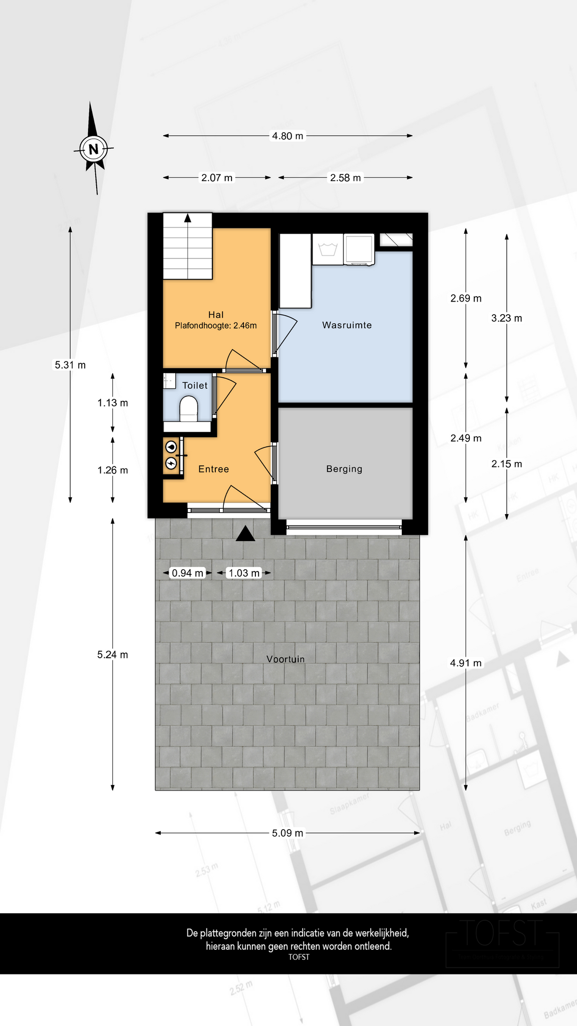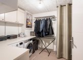 De daarna gelegen hal geeft toegang tot deze wasruimte/bijkeuken, die is voorzien van aansluitingen (met veiligheidsschakelaars) voor zowel de wasmachine als de droger en beschikt over voldoende bergruimte.