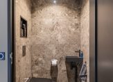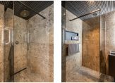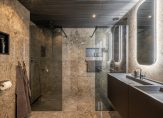 De ruim opgezette moderne badkamer heeft een grote inloopdouche voorzien van thermostatische inbouwkranen met dubbele stortdouche, easy drain regengoot, inbouwvakken, dubbel wastafelmeubel met luxe thermostatische inbouwkranen en spiegels voorzien van verlichting en elektra aansluiting. Verder fraai afgewerkt met moderne natuurstenen vloer- en wandafwerking, betegeld tot het akoestisch houten design plafond met mechanische afzuiging.