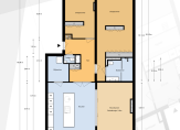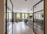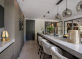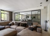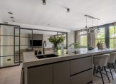 Vanuit de hal komt u middels de dubbele openslaande deuren uit in de luxe woonkeuken. Deze is inclusief woonkamer circa 52 m². De aansluitende woonkamer is gescheiden van de keuken middels industriele stalen glazen wanden, waar u kunt genieten een fijne lichtinval door de grote raampartijen. Door de fraaie afwerking als een mooie plavuizen vloer met hoge plinten en stucwerk afwerking met inbouwarmaturen kan de woning turn key worden opgeleverd. De aangename vloerverwarming maakt de woning extra comfortabel.