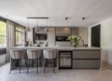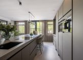 De moderne greeploze open keuken met royaal kook- en spoeleiland voorzien van composiet blad en zitbar is ruim van opzet en biedt u alle hedendaagse keukenapparatuur als een inductiekookplaat met inbouw afzuigunit, vaatwasser, wijnklimaatkast, spoelbak met kokend waterkraan (merk Quooker) en een hoge apparatenwand met combimagnetron, koffie automaat, koelkast, vriezer. Een koffiecorner voor een fijne ochtendstart. En verder is er veel kastenruimte met soft-close lades.