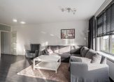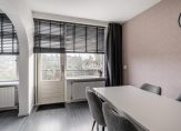De ruime en zonnige woonkamer is aan de achterzijde van het appartement gelegen en kijkt heerlijk vrij weg over de groene omgeving. De woonkamer is voorzien van een moderne hout look laminaatvloer en biedt doorgang naar de eetkamer met toegang tot het zonnige balkon.