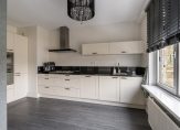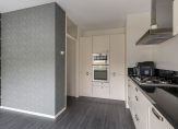 Aan de voorzijde bevindt zich de ruime woonkeuken met bijkeuken/inpandige berging. De keuken is voorzien van alle hedendaagse keukenapparatuur zoals een vijf pits gaskookplaat met afzuigschouw, oven, magnetron en vaatwasser. Via de keuken is er toegang tot de bijkeuken met veel bergruimte en eventueel het plaatsen van een extra koelkast en/of vriezer.