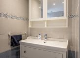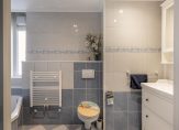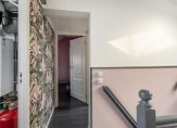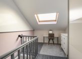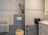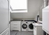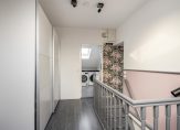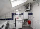 De tweede badkamer beschikt over een dakraam en is voorzien van een douchecabine, wastafelmeubel en een tweede toilet. In de badkamer bevindt zich ook de aansluiting voor de wasmachine en de opstelling van de CV ketel.