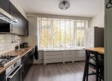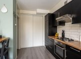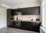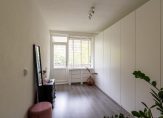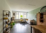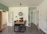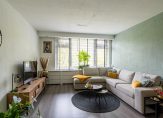 De ruime en zonnige woonkamer van circa 26 m² is aan de achterzijde van het appartement gelegen en kijkt heerlijk vrij weg over het groen. De woonkamer is voorzien van een moderne hout look laminaatvloer, radiator ombouw en inbouw plafond spots.