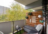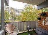 Heerlijk balkon circa 5 m² gelegen op het zonnige zuiden, voorzien van vlonder delen en een uitzicht op de groene omgeving.