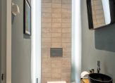Separaat moderne toiletruimte welke is voorzien van hangend toilet. waskom en fraaie indirecte verlichting.