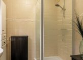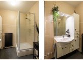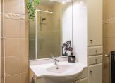 De keurige badkamer is voorzien van een douchecabine, wastafelmeubel met spiegel en verlichting, radiator, betegeld tot het plafond en mechanische afzuiging.