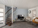 De sfeervolle woonkamer heeft een mooie pvc vloer en beschikt verder over een fijne lichtinval en een open trap naar de eerste etage. Via de woonkamer komt u in de half open keuken.