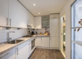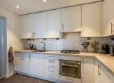 De keuken is gelegen aan de achterzijde en is voorzien van een crème kleur hoekopstelling en vernieuwd grijs aanrechtblad. Allen hedendaagse inbouwapparatuur is aanwezig zoals een gaskookplaat, afzuigkap, koel-vriescombinatie, combimagnetron en een vaatwasser.