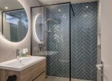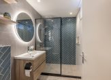 De badkamer is volledig betegeld, ruim van opzet en voorzien van een inloopdouche met zowel regen- als handdouche, wastafelmeubel, toilet en designradiator.