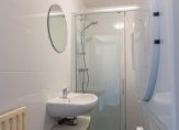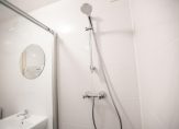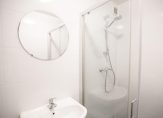 De moderne badkamer is geheel betegeld in hedendaagse grijs-wit tinten en is voorzien van een fijne inloopdouche, wastafel en aansluitingen voor de wasmachine en droger.