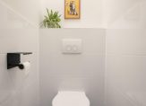 Het toilet is separaat, eveneens keurig betegeld en voorzien van een hangend toilet.