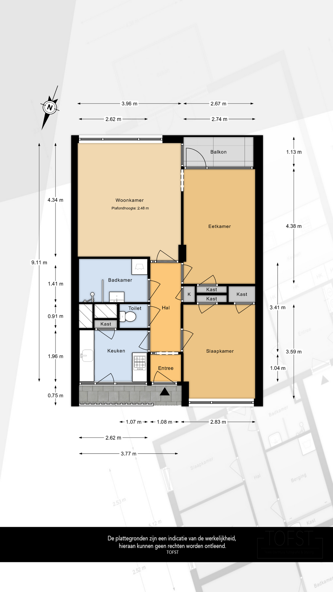 Nadat u gratis uw auto op het voorgelegen parkeerterrein heeft geparkeerd, of uw fiets in uw eigen berging heeft gestald, heeft u middels de afgesloten entree met bellentableau en brievenbussen toegang tot de centrale hal van het complex. Middels zowel de trap als de lift wordt u de toegang tot de woning verstrekt, welke is gelegen op de eerste woonlaag. Let wel de lift stopt op een tussenlaag en u moet te allen tijde nog een trap op- of af.