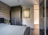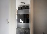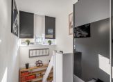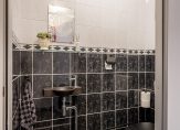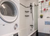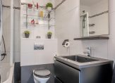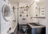 De badkamer is volledig betegeld in antraciet/witte kleurstelling en beschikt over een ligbad met douche, wastafelmeubel, tweede toilet en de aansluiting voor de wasmachine.