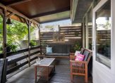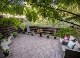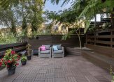 De achtertuin is op een speelse wijze ingedeeld met een onderhoudsvriendelijk terras en vlonder delen aan het water, waardoor verschillende zitjes gecreëerd kunnen worden.