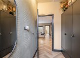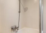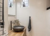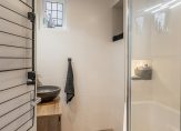 Vanuit de woonkamer komt u uit in een tweede centrale hal en vanuit hier wordt de toegang verstrekt tot de moderne badkamer, welke is voorzien van hoekbad met douche, elektrische vloerverwarming, modern wastafelmeubel met waskom en verlichtbaren spiegel, spots, speelse nissen, afzuiging en een raampje voor natuurlijke ventilatie.