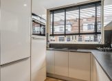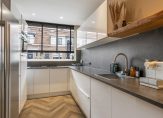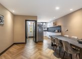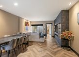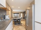 De moderne keukenopstelling is door de fijne indeling van alle gemakken voorzien en beschikt over een losse Amerikaanse koelkast, inductie kookplaat met geïntegreerde afzuiging, vaatwasser, combi-oven en veel opbergruimte.