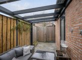 De knusse onderhoudsvriendelijke achtertuin is gelegen op het zonnige zuidwesten en voorzien van een sfeervolle overkapping met zonwering, spots en elektra. Tevens beschikt de tuin over een achterom en hoekje om de fietsen te parkeren.