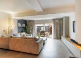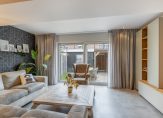 De lichte woonkamer beschikt door de grote raampartij over veel natuurlijk licht en is voorzien van een pvc vloer met vloerverwarming, een sfeervolle open haard en strakke wand- en plafondafwerking. Via een schuifpui is er toegang tot de achtertuin.