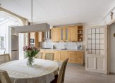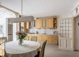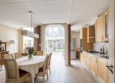 In het midden van de living vindt u de complete keuken, circa 10 m², voorzien van alle hedendaagse keukenapparatuur zoals 4-pits gaskookplaat met afzuigschouw, magnetron en aparte oven, vaatwasser en een geïntegreerde spoelbak.