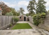Ruim 16 meter diepe en onderhoudsarme achtertuin voorzien van groot zonneterras, kunstgras strook, houten erfafscheidingen, en vrijstaande stenen berging (circa 17m² ) en achterom.
